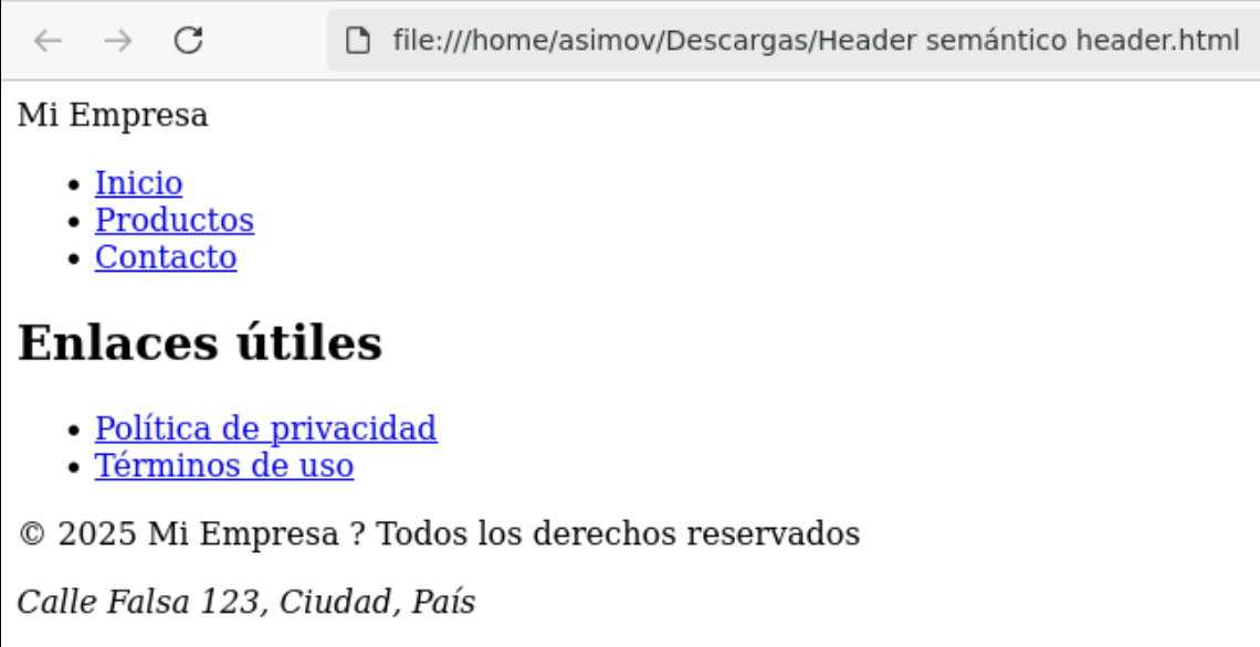 <header>debe aparecer antes del<main>y el<footer>después. - Enlaces internos: Coloca enlaces a páginas importantes (Política de privacidad, Sitemap) en el footer para reforzar la arquitectura de enlaces.
