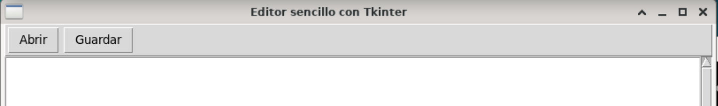 import tkinter as tkfrom tkinter import filedialog,messageboxdef abrir_archivo():r=filedialog.askopenfilename(filetypes=[('Texto','*.txt'),('Todos','*.*')]) if r: with open(r,encoding='utf-8') as f:txt.delete('1.0',tk.END);txt.insert(tk.END,f.read())def guardar_archivo(): r=filedialog.asksaveasfilename(defaultextension='.txt',filetypes=[('Texto','*.txt')]) if r: with open(r,'w',encoding='utf-8') as f:f.write(txt.get('1.0',tk.END)) messagebox.showinfo('Guardado','Archivo guardado')root=tk.Tk();root.title("Editor simple")txt=tk.Text(root);txt.pack(fill='both',expand=True)tk.Button(root,text="Abrir",command=abrir_archivo).pack(side='left')tk.Button(root,text="Guardar",command=guardar_archivo).pack(side='left')root.mainloop()