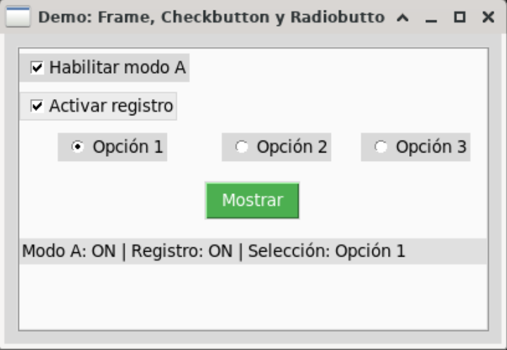 El siguiente script combina Frame, varios Checkbutton, Radiobutton y muestra el estado en un Label al pulsar un botón "Mostrar".