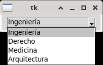 El widget ttk.Combobox pertenece al paquete temático ttk y combina la funcionalidad de una lista desplegable con la de un campo de texto editable. Por defecto, sólo permite seleccionar un ítem, lo que lo hace perfecto para formularios que requieren una única elección.